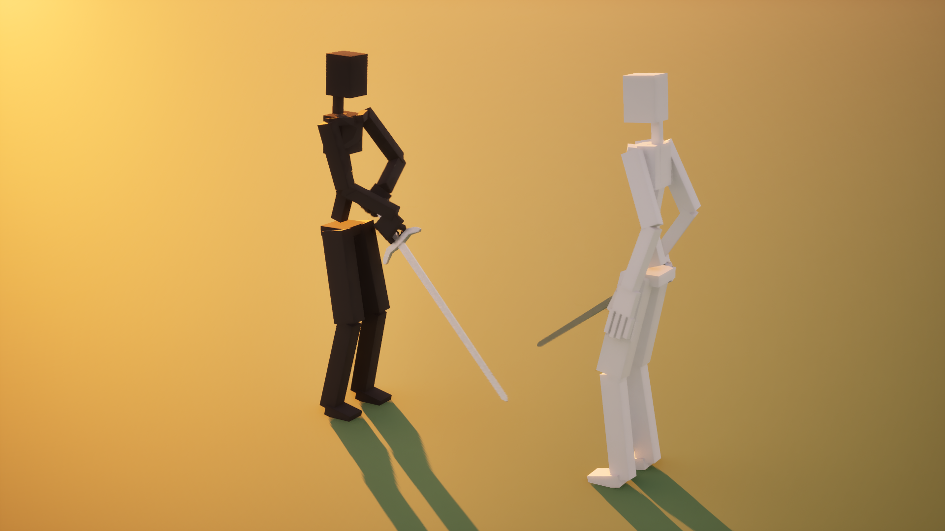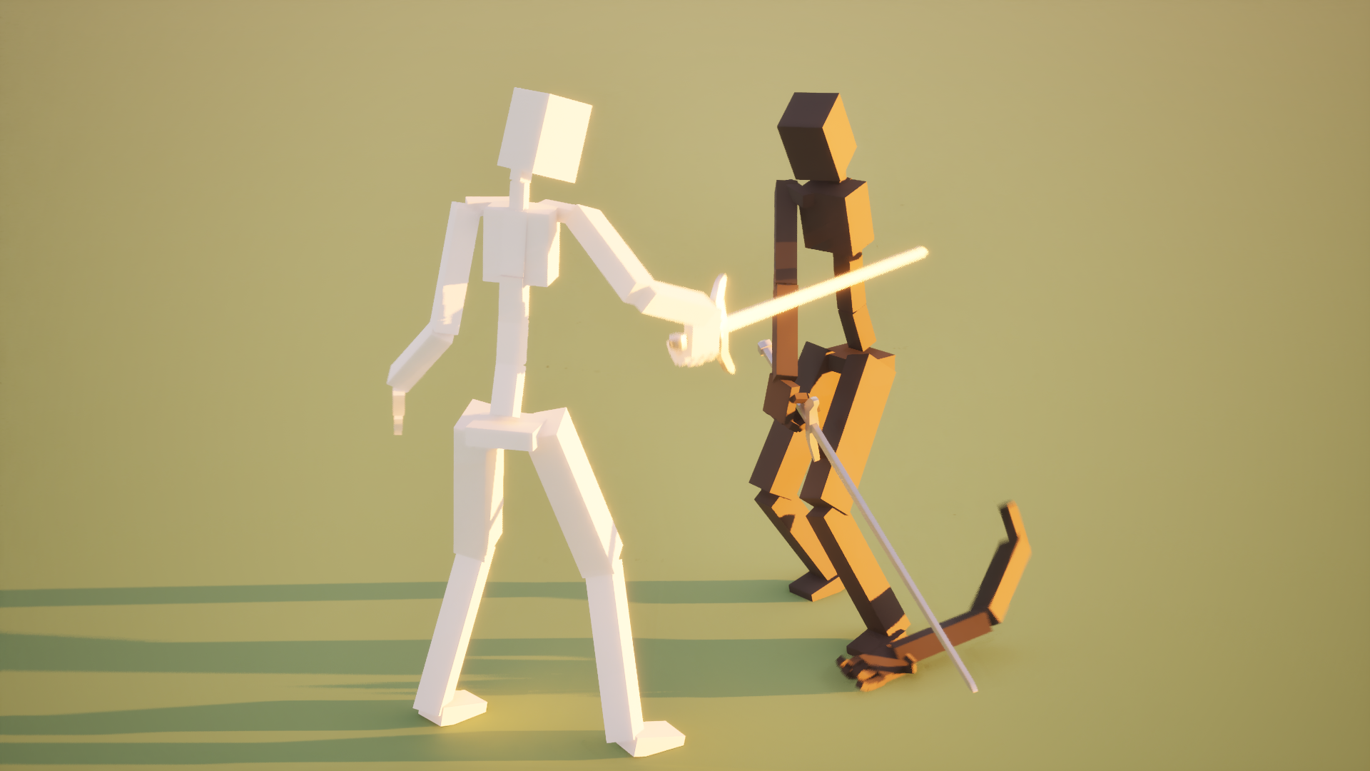 I set up the lighting to be dramatic, with long shadows, and the camera to pan slowly around the fighters to add a sense of flair and excitement to the scene.